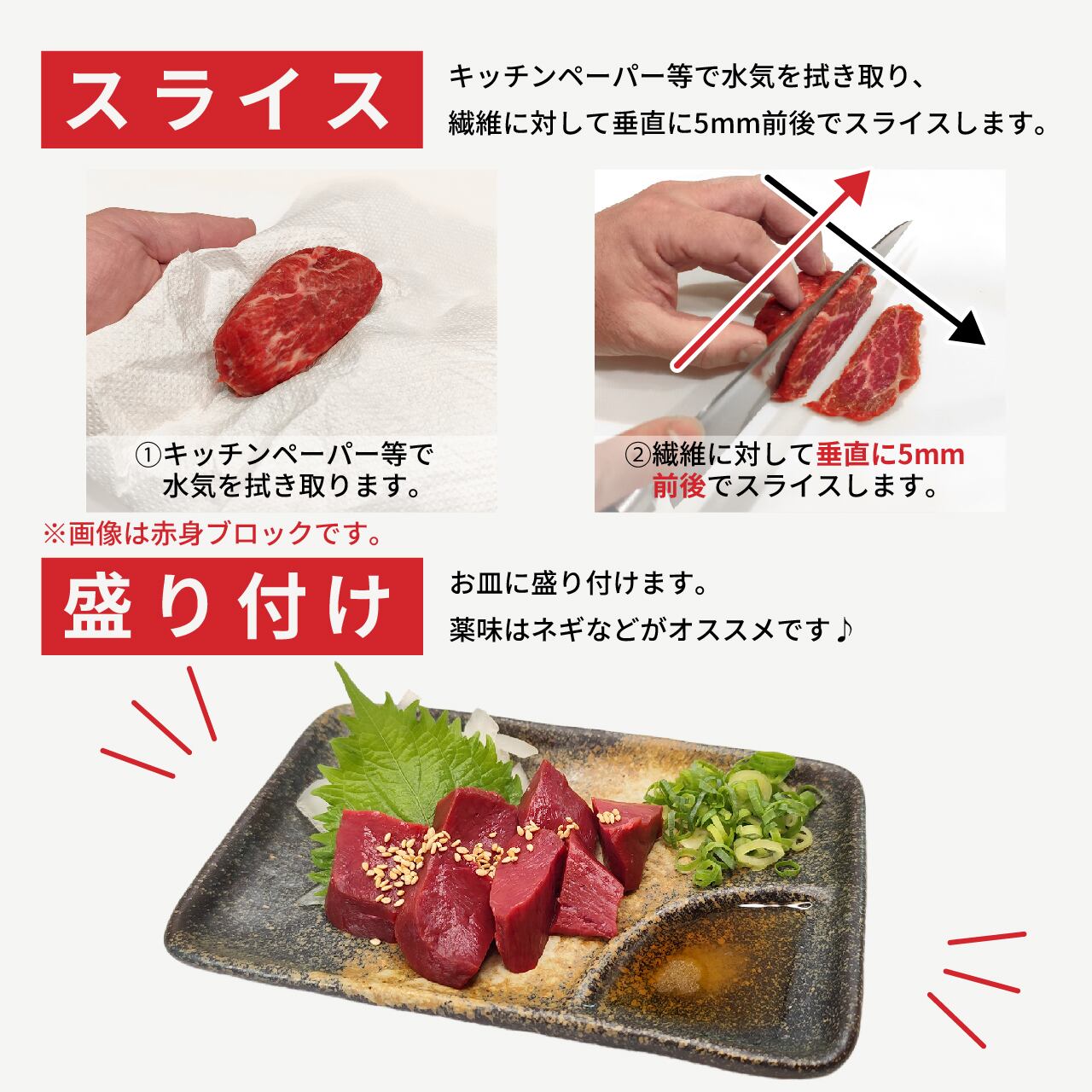 馬刺しは冷凍ブロックになっていますので、解凍後スライスしてお召し上がりください。